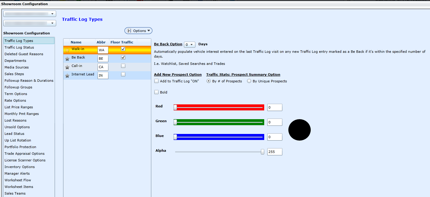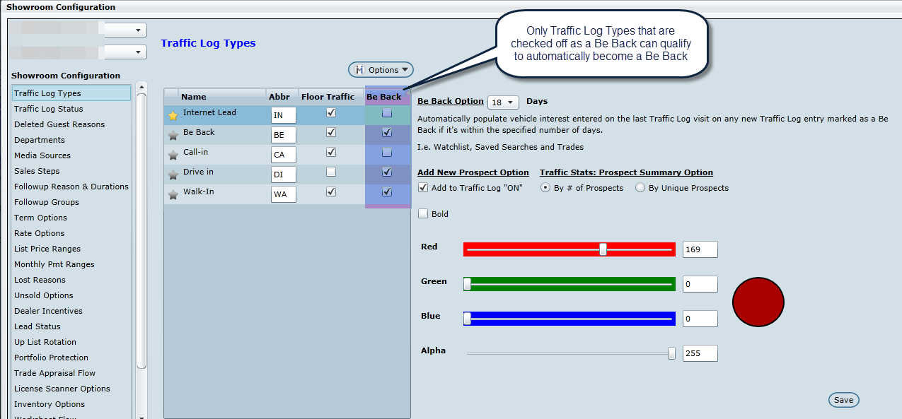 Now each Store can specify which Traffic Types can become a Be Back if logged twice within the specific number of days. In Showroom Configuration > Traffic Types a user can select the number of days in the "Be Back Option" drop down and then place a check in the Be Back check box for the Traffic Types that will be flipped to a Be Back on a Traffic Log entry when saved. If the entry is out side the specified number of days it will save to the Traffic Type entered when saving the Traffic Log entry.