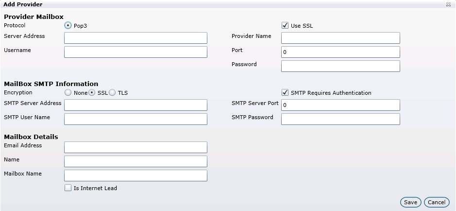 If the Dealership has Service only, and if the provider is to be used for Leads, check the box Is Internet Lead and select the radio button Service Lead. Emails sent to the Service Lead provider are viewed in the Service Lead folder in the email inbox. If the Dealership has access to Showroom, and the provider is going to be used for Showroom Leads, check Is Internet Lead, and click the appropriate radio button for Showroom Leads. Emails sent to the Showroom provider are viewed from the Leads tab. Continue to configure the email accounts on the Service/Showroom Leads tabs. Â