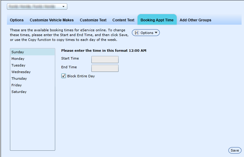 If a Dealership is open on a certain day of the week, but would like to block an entire day from their eService portal calendar to prevent a customer from booking an appointmnet, from the Administration screens, select eService Configuration->Booking Appt Time-> select the day of the week from the list box, and check Block Entire Day and click Save. The customer is now unable to book an appointment for the blocked day.Â