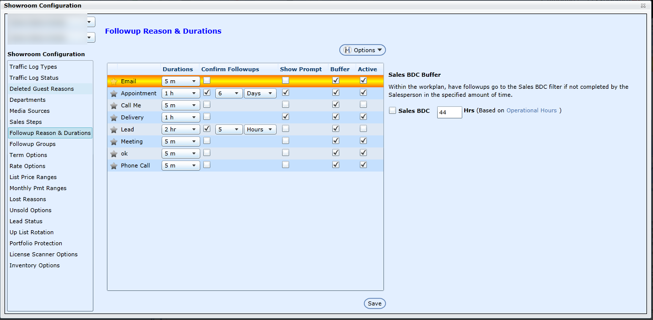 Followup reasons can be selected for the Sales BDC Buffer, although all will be 'on' by default when activating this feature. Simply uncheck any of the Followup Reasons you do not wish to send to the Sales BDC and only those that are left checked will be visible in the Workplan > Sales BDC filter.Â