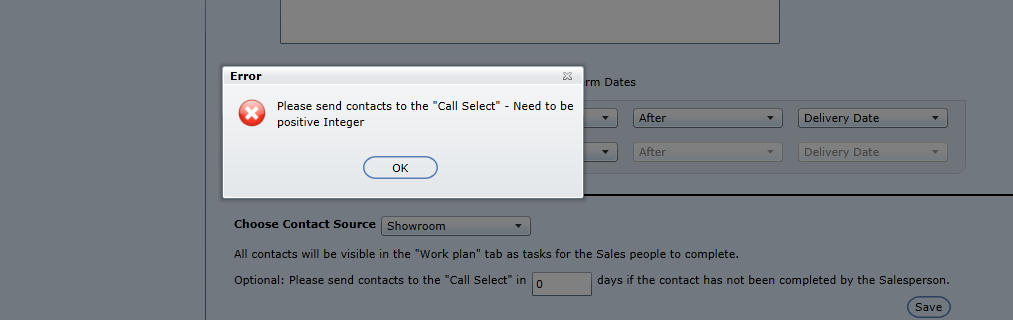 When in Sales Schedules Setup and entering a value to send contact to the Call Select in a specified number of days the value must be a positive integer or a null value to save, if a 0 is entered the user will receive an Error message.Â