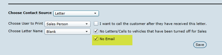 "No Email" option - when setting up a Sales Schedule to be sent as a Letter we will now allow you to exclude customers with email addresses. Once Letter is chosen as the Contact Source the "No Email" check box will display. When the "No Email" check box is checked this will exclude customers with an email address from receiving a letter.Â
