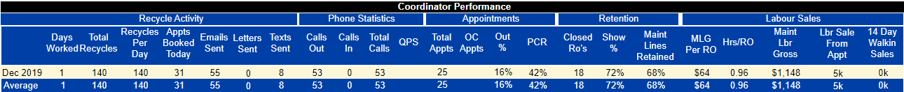 MLG Per RO - The average Maintenance Labor Gross Sold by that appointment coordinator per ROÂ