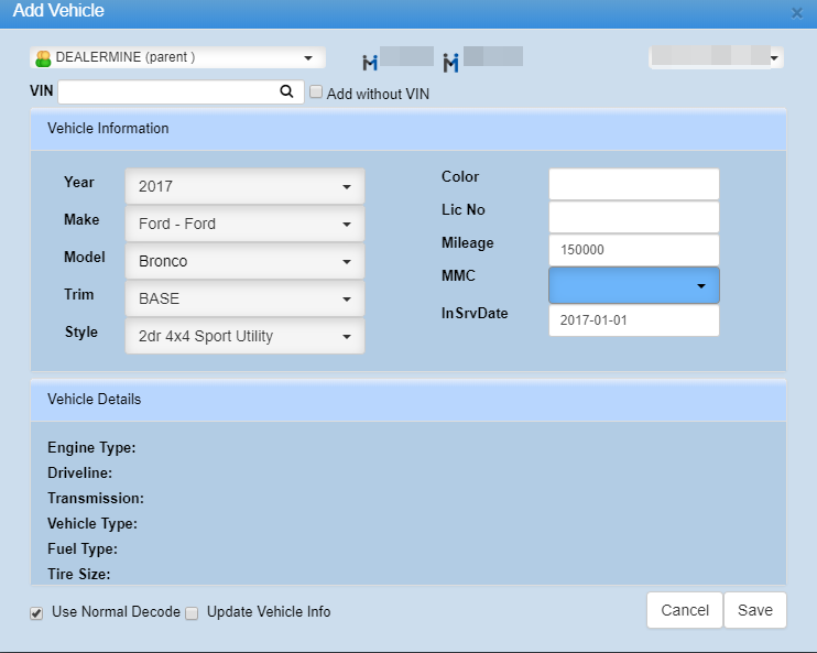 *For ADP/CDK Stores only the check box "Update Vehicle info" at the bottom of the "Add Vehicle" screen, allows a user to change the *Model of the selected vehicle to the correct Model, once Saved the change will push to their DMS.