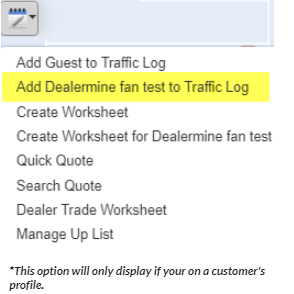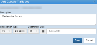 When on a cusotme's file and you click on the Add UP action button the option to add that customer to the Traffic log will display.  The "Add Guest to Traffic Log" popup will display and the Customer's name in the Description box.