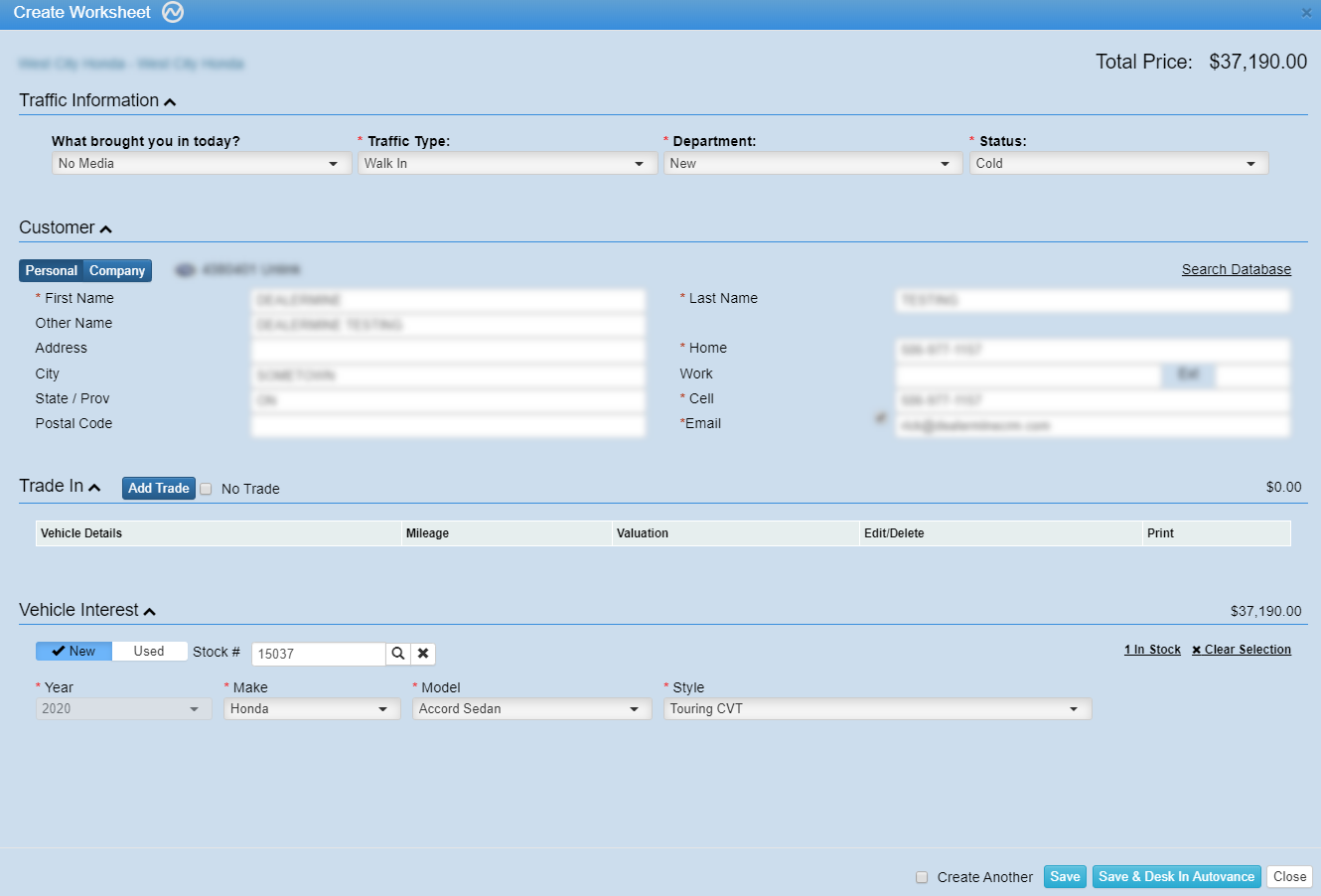 Depending on the sales process at the Dealership, a salesperson may or may not have access to the "Save & Desk In Autovance" button.Â