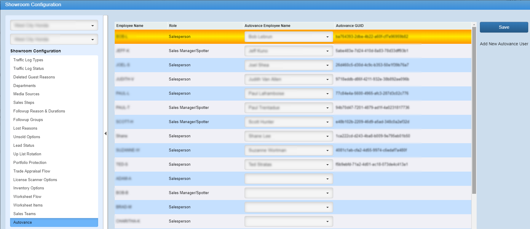 Once a user is setup as of one of the three user types: Salesperson, Sales Manager/Spotter, or a General Manager, they will display in the Autovance Setup Screen.