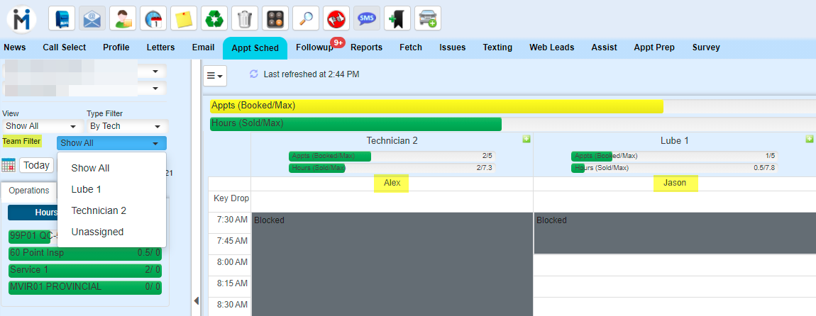The Est time and Appt count of each Tech will make up the Appts (Booked/Max) and Hours (Sold/Max) for their Team.Â