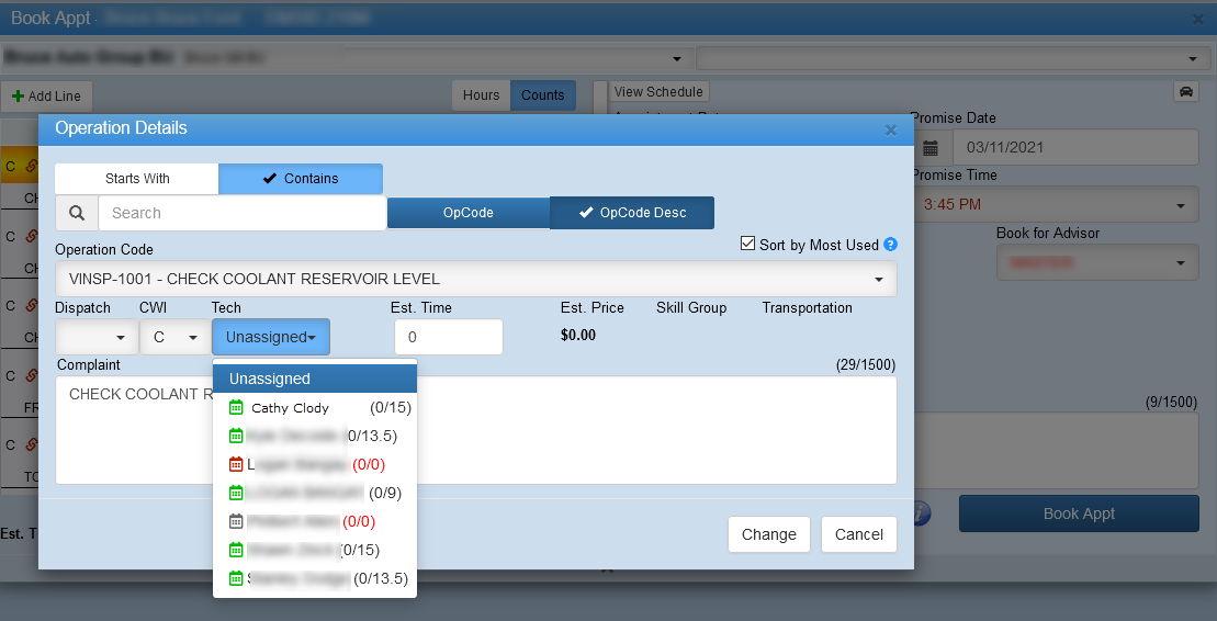 When booking an appointment and the DMS is able to pull and push a tech on a service line, a Tech drop down will display in the "Operation Details" popup when Adding a line in the Book Appt form.  All the Techs will display in the drop down, for the Store/Branch they are booking for.