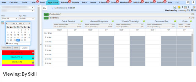 By Skill sorts appointments based on the skill group.This view displays the appointment schedule by the skills associated with various opcodes, and it has limited number of slots for each of these skill types.Â