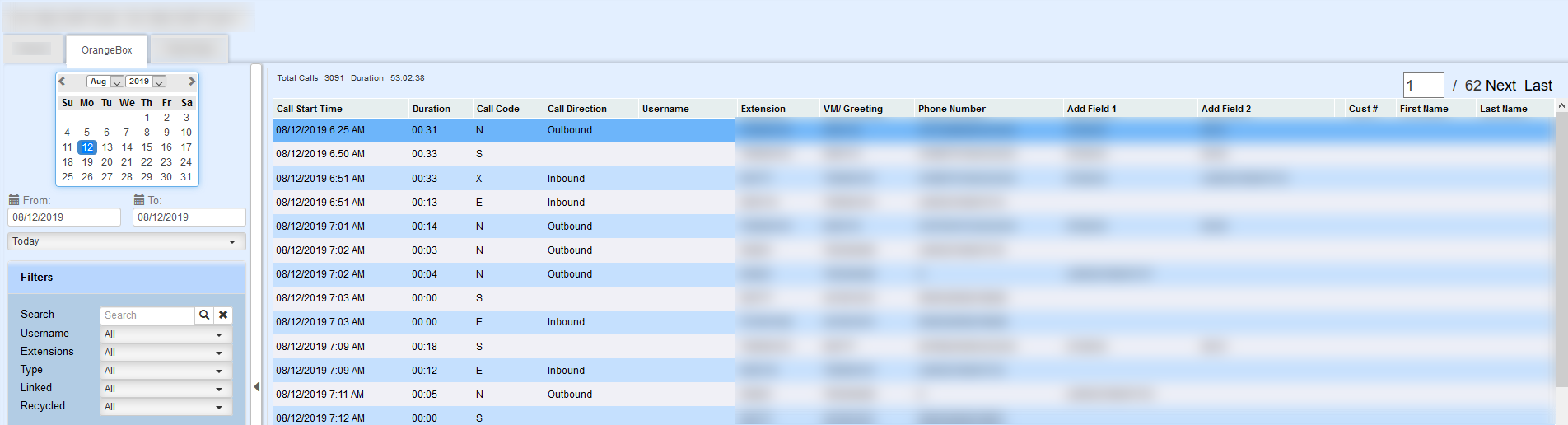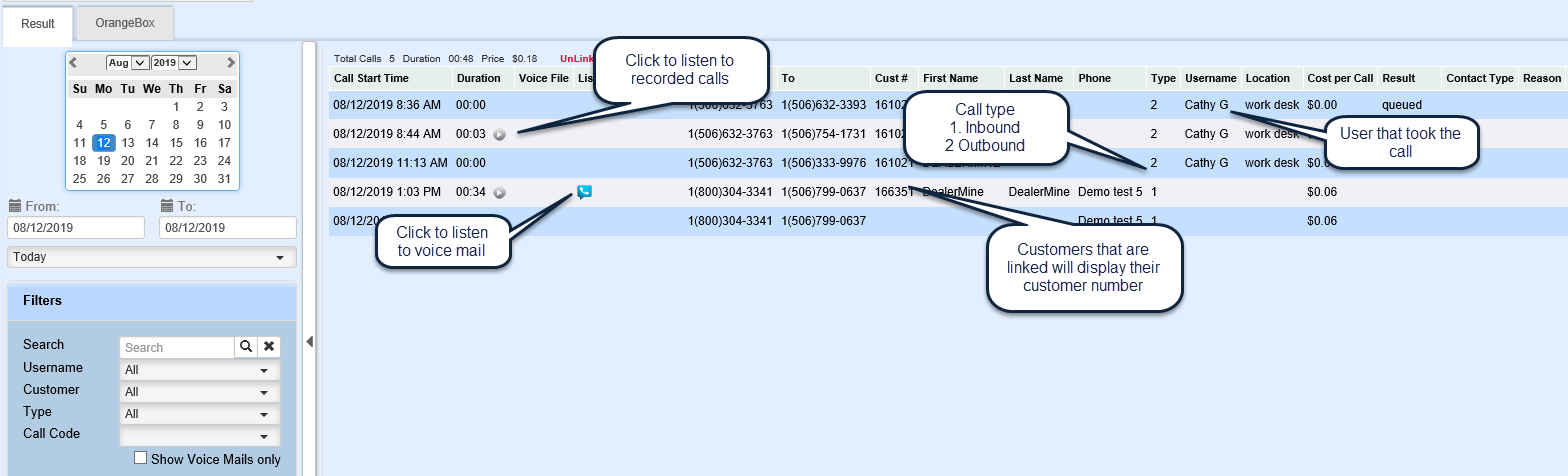 The Orange Box tab will consist of a Calendar and date selector drop down, filters to drill down on searches. At the top of the Orange Box grid we will display the Total Calls and the total Duration for the select date range and filter selections. A user can also Search (link) and Unlink by right clicking on a log on the grid. When a Log is linked to a customer's file the recorded file will display on the Contact Hist tab and the user will be able to click the play icon and listen to the call.