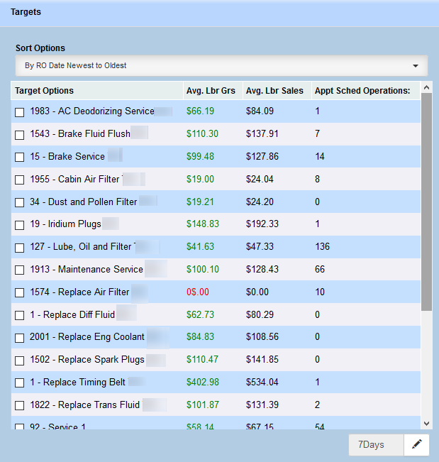 Target Options - Maintenance groups for the corresponding store/branch will be listed in the Target Options column, indicating how many VINs are due for each particular maintenance item. Â
