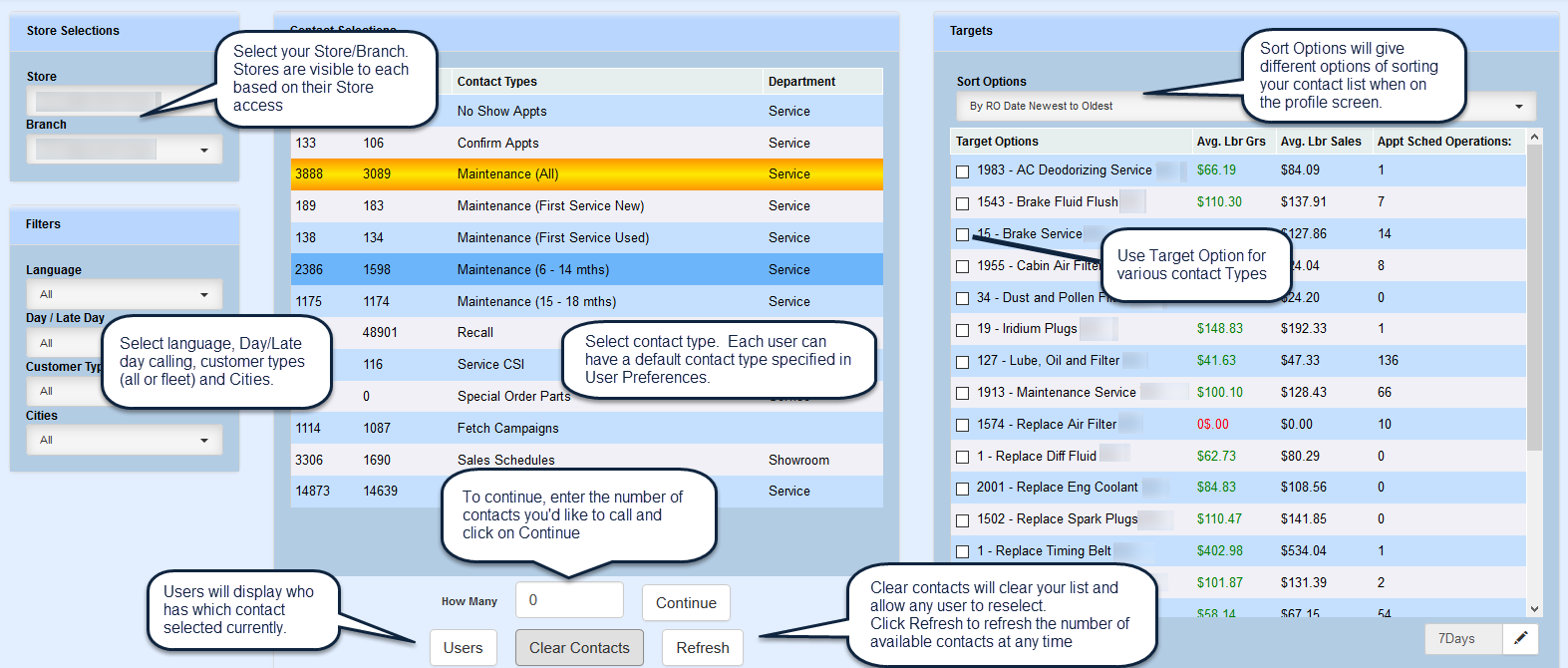 Target Options - these options will change based on which Contact Type you have selected. Maintenance allows you to target specific maintenance services; Service Followup allows you to target CP, WP or IP (based on setup); Recalls will list all campaigns for selection; Special Order Parts will list Front or Back Counter; Fetch Campaigns will simply list all campaigns still active that were sent to Call Select; Declined Work displays the declined ROs with the refused work.Â