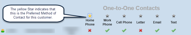 When a user is selecting the customer's Preferred Method of Contact in Contact Methods (Customer Specific)>One-to-One Contacts they will be presented with greyed out Stars over each contact method. Simply click the star over the preferred method of contact and the selection will present a yellow star. When going back to the profile view the yellow star will display beside the contact method selected in Contact Methods (Customer Specific). No stars will be presented at all if no selection has been chosen.