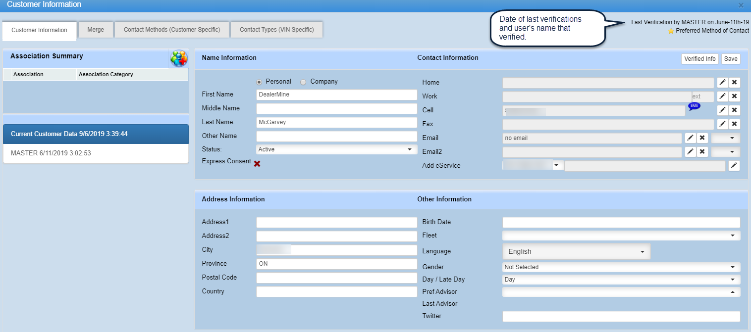 Last Verified - On the Customer Information screen, to the left of Save, is the Verified Info button, when this button is clicked, the Last Verification date updates which is displayed above the button Last Verification: months and days. The purpose of updating the verification information is to display the last time the customer's contact information was verified; therefore, the Appointment Coordinator doesn't have to ask the customer to verify their information every time they call (which can be a couple of times a week). This information is also displayed under the Twitter symbol on the Profile screen.