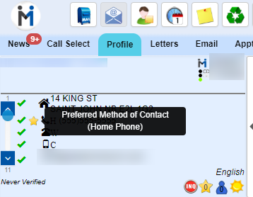 When a user selects the customer's Preferred Method of Contact in Contact Methods, DealerMine will display a Yellow Star beside the preferred method in the Customer Info section of the Profile screen. To set the Preferred Method of Contact go to Editing Customer Information > Contact Methods.. When the user hovers over the Yellow Star on the Profile screen, a tool tip will display "Preferred Method of Contact". If no Yellow Star displays this will indicate no preference has yet been specified.