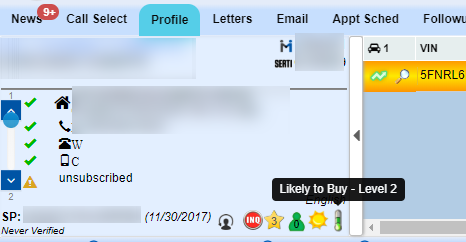 If a Dealership has purchased Showroom/Equity, an icon of a Thermometer will also display next to the customer's name. The icon represents if the customer is "Likely to Buy" a vehicle. Place the cursor over the Thermometer and displayed is "Likely To Buy Level #". The number is based on a scale of 1 through to 3; 3 being the most likely to buy.Â