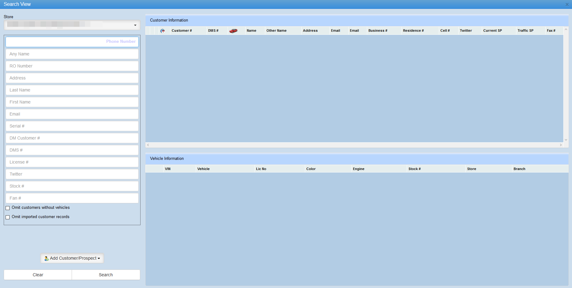 To refine the search, it's possible to Omit customers without vehicles or Omit imported customer records by selecting the the correlating check boxes below the search fields.Â