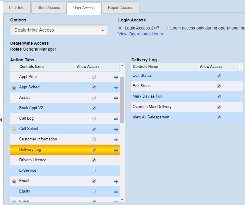 Access to the Delivery Log is setup in ‘User Setup’ > ‘User Access’Â