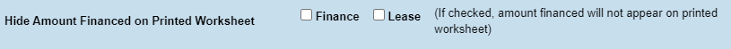 In Desking configuration > Desking Options users now the ability to Hide Amount Financed on Printed Worksheet for finance and lease. If checked, the amount financed will not appear on the printed worksheet.Â