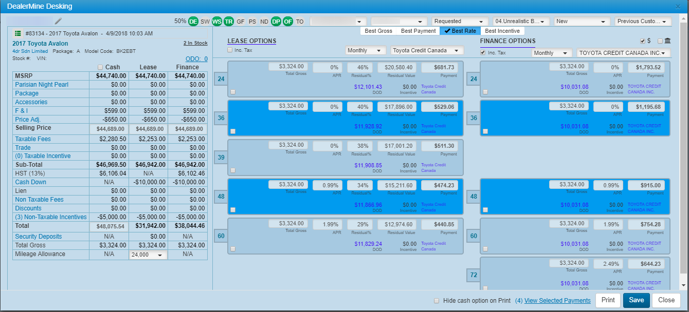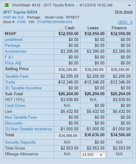 NOTE: The left-hand columns are showing the best possible result, so you may an incentive total that is not reflected in the payments to the left. As example you may see $4000 as selected because technically you can apply it to an finance deal but not to the OEM. If the customer goes through BMO they qualify for the incentive but if they go through TCCI they do not be sure to look on the right-hand side to see the total incentive applied based on the financial institute selected.Â