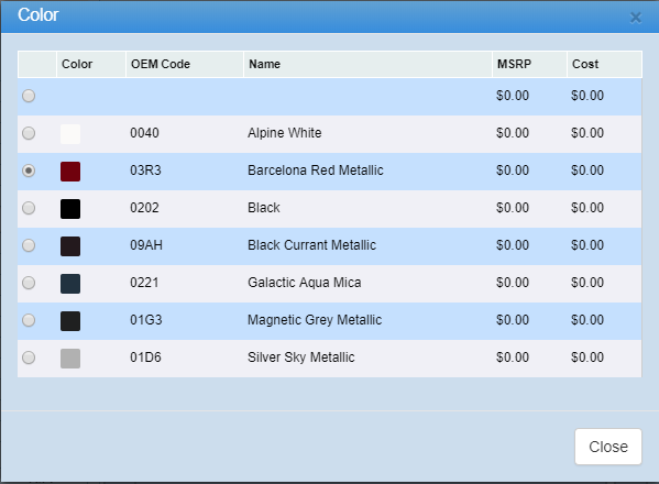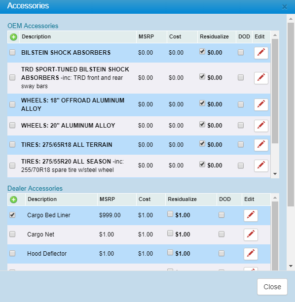 In this pop up, you can quickly distinguish between OEM accessories and the dealership pre-loaded accessories. To add an accessory that is not is not present simply select the green plus in the top left-hand corner.