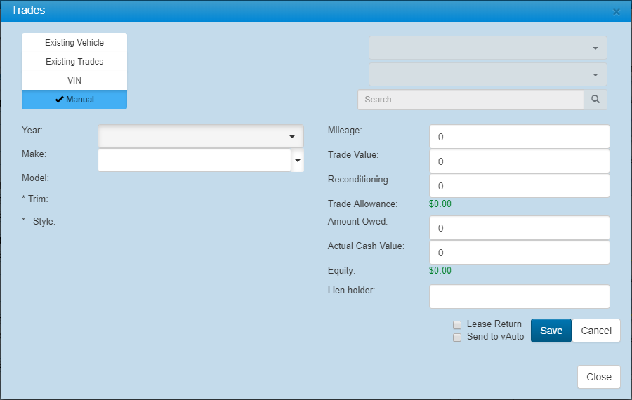 Existing Vehicle - To select one of the customer's existing vehicles on file, click the drop down, and select the vehicle. The bottom of the screen populates with the vehicles information: year, make, model, trim, style, mileage, trade value, amount owed and equity; from these fields, the following can be adjusted: trim, style, mileage.Â