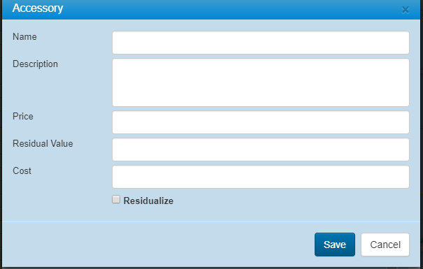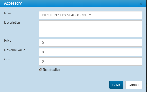 Once in this screen, you can fill in any necessary information needed to add the accessory. The added item will then display in the correct accessory list (either OEM or Dealership).Â