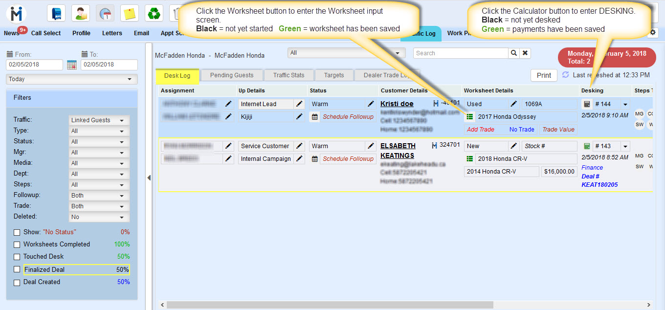 A black calculator symbolizes a completed worksheet that has not been desked where a green calculator symbolizes a deal has been desked and saved/printed.