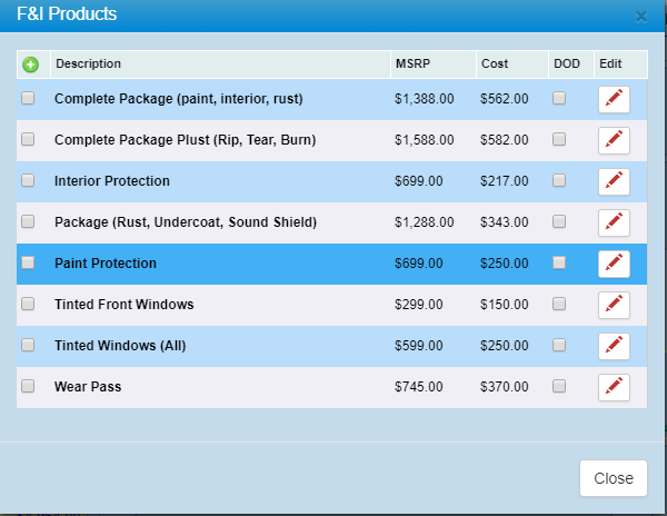 To add an F and I product that is not present, simply select the green plus in the top left-hand cornerÂ