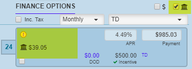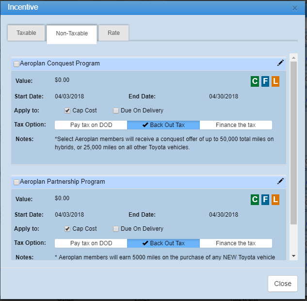 Non-Taxable Incentives: Allows you to see all of the possible non-taxable incentives that are available for the selected vehicle. The number on the left (#) represents the number of incentives available. While the number in each column for finance, lease and cash show where the incentives can be applied.