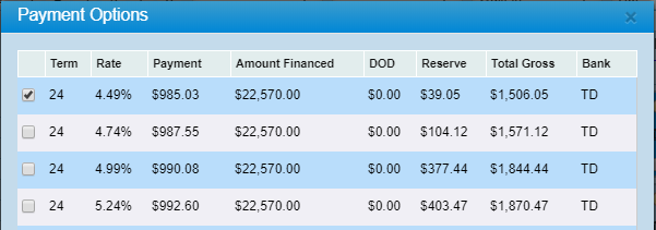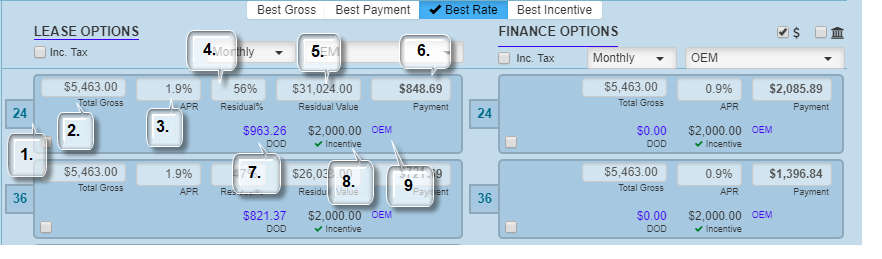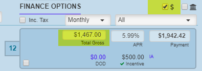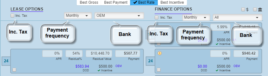 The Payment Matrix- From left to right the matrix will load all payments listed by terms for lease and finance. Each payment section will have an option to Include tax. If checked all payments in that section will include tax, if unchecked no tax is included.