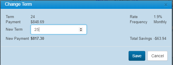 3.    APR: To change the APR simply place your cursor in the box and enter the desired APR and hit enter. DealerMine will automatically make all the necessary adjustments, highlight the APR blue so you can easily identify that the APR has been changed, and provide a method to undo. Â