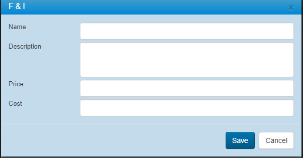 Once in this screen you can fill in any necessary information needed to add the F and I product. The added item will then display in the F and I pop up.Â