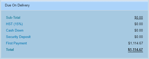 I.e. $2000 cash down would be $1770 + $230 (13% tax), or the customer would pay $230 due on delivery.Â