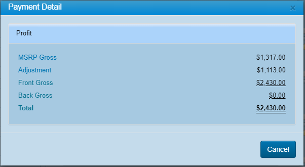 Total Gross- Allows you to see the gross on the deal and by selecting will provide you an in depth look at what it is made up of.Â