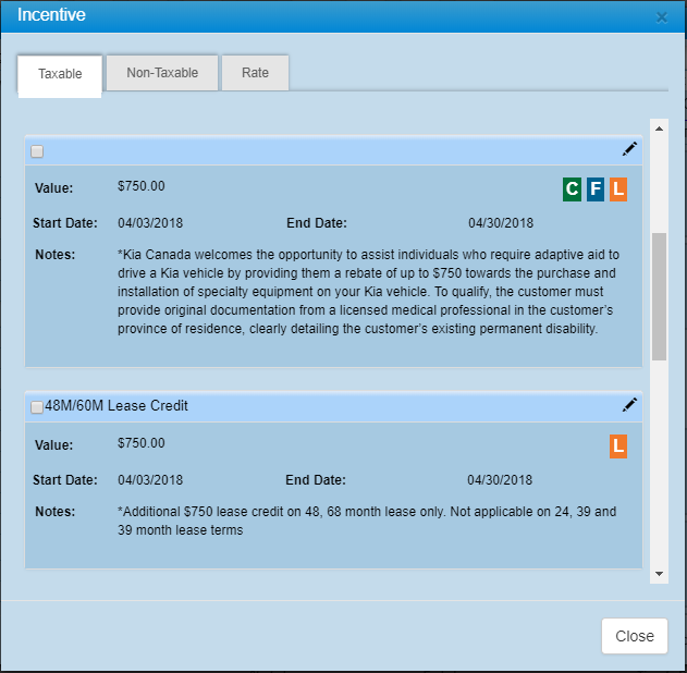 You will also be able to see a description (if available) of the Incentive and if it can be applied to cash, finance, or lease as represented by the C, F, LÂ i.e. If all three are shown this incentive qualifies for cash, lease, finance; if only L then the incentive is for Lease only.Â