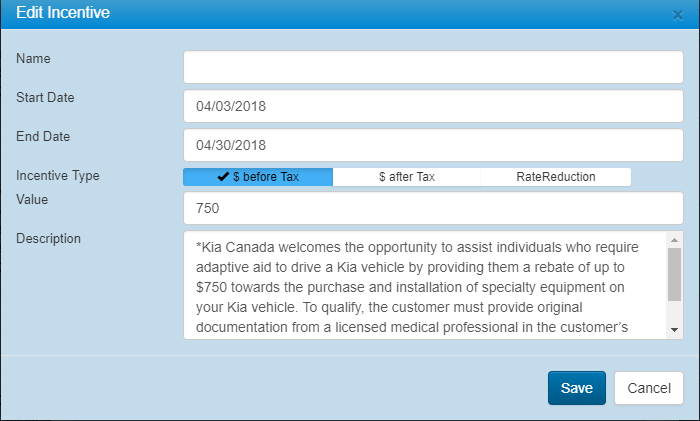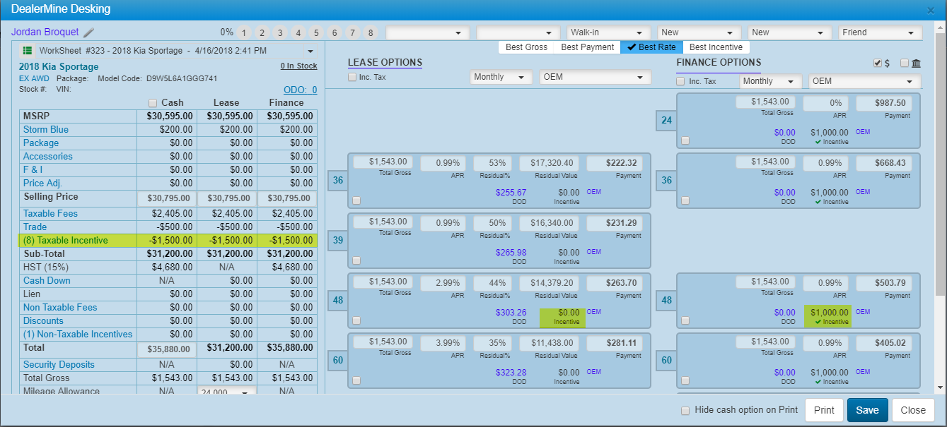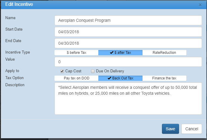 Taxable Incentives: Allows you to see all of the possible taxable incentives that are available for the selected vehicle. The number on the left (#) represents the total number of incentives available. While the number in each column for finance, lease and cash show where the incentives can be applied.