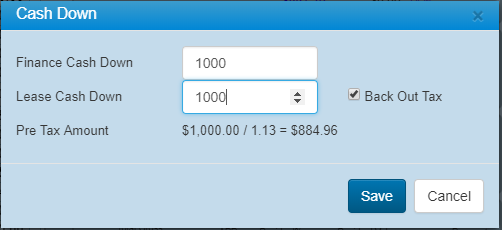 This popup will also clearly indicate the cash down tax calculation and the user can select to back out tax by checking the "back out tax" check box, which will only affect the lease payments.