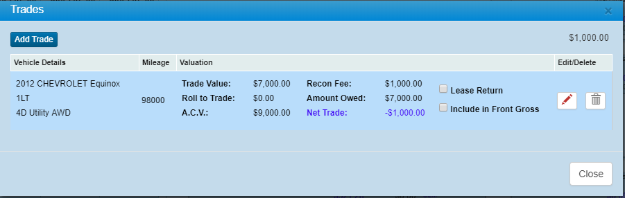 1)The Trade Value- regardless of amount owed (i.e. $10,000 Trade Value – Amount Owed $2000 = $8000 Net Trade) will still display the trade value of -$10000 or a positive if the amount owed is greater than the trade value.Â