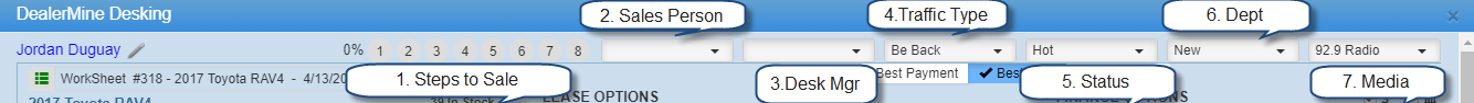 Desking begins when a worksheet has been saved for any customer. This means after a name, vehicle interest (and any other mandatory fields) have been completed and saved on the Worksheet.  See Worksheet Flow for more details.  There are two ways to begin Desking a deal as follows:
