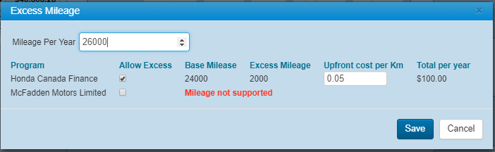 Custom Mileage- When in the desking screen a user can enter in a custom mileage by simply clicking on the mileage drop down and selecting custom. When custom is selected the excess mileage, popup will display and the user can enter in a Custom mileage in the Mileage Per Year box, Upfront Fee and save. When the popup closes the custom mileage will display and will also update the Payments, DOD and LEV. The system will only allow a user to enter custom mileages when they're able. Most times you must exceed the existing mileage allowances first to create a custom. I.e. 25,000 km a year would be available since it exceeds 24,000 kms, but 23,000 kms a year wouldn't be allowed. Â