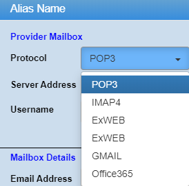 An alias Name window will populate, select the Protocol of the email you are setting up, there are six options to choose from: