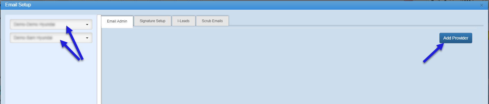 The email setup screen allows users to create edit and give access to different emails. There are four tabs in Email Setup: