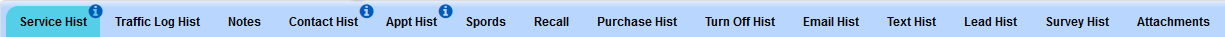The History Tabs can be located within the customer profile. The History Tabs will allow you to quickly access important information you may need to know when contacting a customer. If there is information contained under one of the history tab a blue indicator will display on the tab's header.