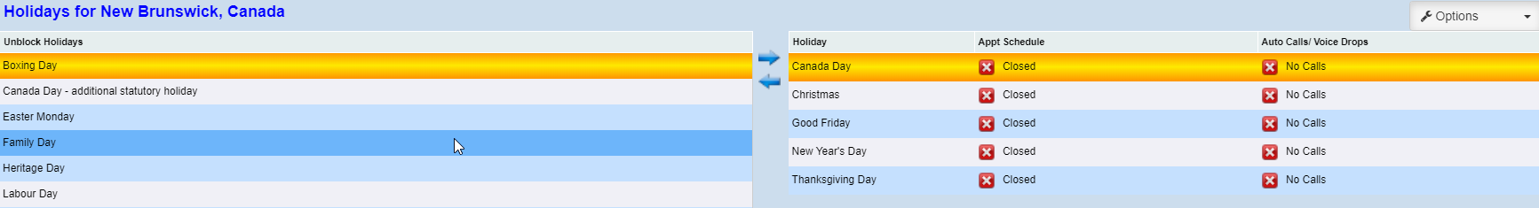 The left column shows all unblocked holidays and the right column shows all holidays that can be blocked.
