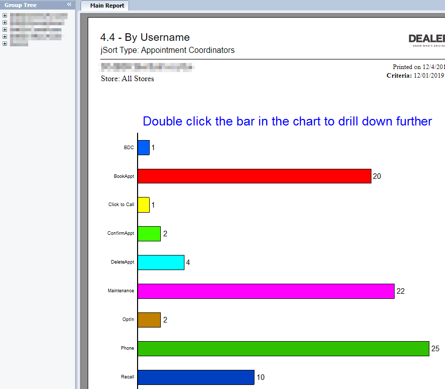 Key report 4 can be found under the reports tab using the path Key Reports > #4 - Contact Analysis > ** NEW ** - Contact Analysis. Key Report 4 is a live report that can be run at any time. This report was created to track all contacts recycled and appointments booked for all DealerMine users. Key Report 4 can be run for any time frame.
