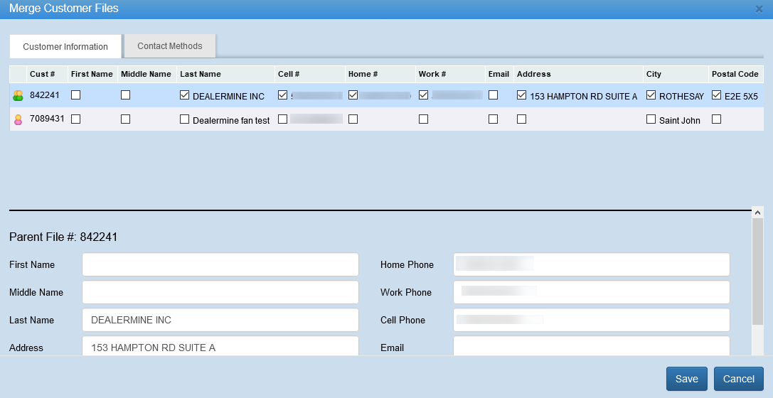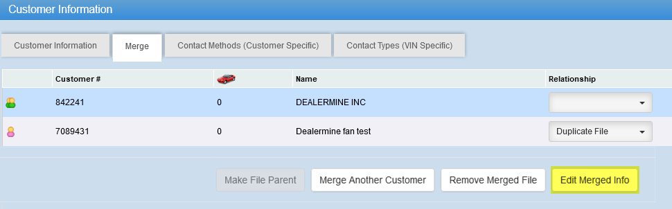 Dealerships that are user the "Use Customer File Merge Screen " will be able to choose which information between all accounts will display on the parent account. In the screenshot, you can see that all boxes checked is the information that displays in the fields below. For example, if the last name DEALERMINE was checked instead of DEALERMINE TEST, DEALERMINE would display in the last name field.