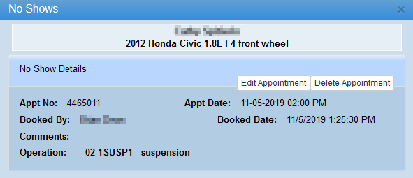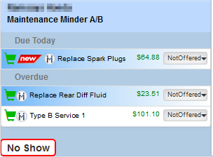The Indicator will show in the bottom left of the recommended maintenance section of the profile screen. The No Show indicator is VIN specific and will on display if the correct VIN is selected. Once the indicator has been clicked a No Show popup window will display.