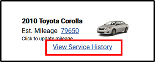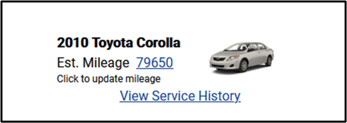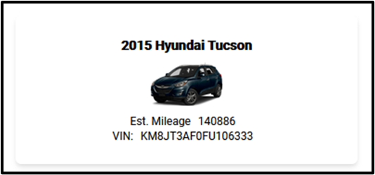 This screen will display the Year, Make and Model of the customers vehicle(s), the current estimated mileage of the vehicle, as well as the VIN, which is partially starred out for security purposes, and if available, a stock photo of the vehicle type. This photo is pulled from Chrome Data, and as such will not match exactly to the customer’s vehicle or it may not display at all.